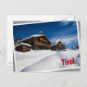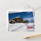 Fotovykort av ett par traditionella trästockskåp eller -kritor som är täckta i snö under ett blå himmel i ett skidortsområde i Alpernorna i Österrike på vintern med ett vitt kant och i rött texten "Tirol". Bilden roteras en bit för att skapa illusionen att den lossnar.