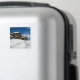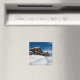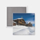 Fotomagnet från Souvenir med ett par traditionella trästockskåp eller -kritor som är täckta i snö under ett blå himmel i ett skidortsområde i Alpernorna i Österrike på vintern.