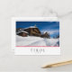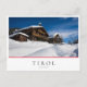 Fotovykort av ett par traditionella trästockskåp eller -kritor som i snö under blå himmel i ett skidorteringsområde i Alpernorna i Österrike vintern med vitt kant och i en vit ruta texten "Tirol, Österrike". Kortet har rand i rött, vitt och rött, det österrikiska flagga färger.
