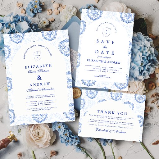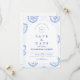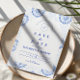 En elegant blå och vit chinoiseriedesign inspirerad av klassiska Delfts blå porslinsmönster. Den invecklade blomsterbården omger en ren central panel och skapar ett förfinat och tidlöst uttryck för sofistikerade bröllopsfiranden. Ömt europeiskt toaljearbetat konstverk kombinerat med skarp marinblå typografi ger designen en arvsestetik som påminner om fint porslin och vintage pappersvaror. Perfekt för par som planerar ett klassiskt blå-vit bröllopstema med traditionell elegans.