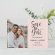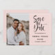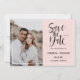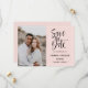 Elegantens fotot sparar datumet, med ett foto av lodrät för favoritbilder på förlovningen på lämnat sida, med information om bröllop på högerna omgiven av vit ram. "Spara datumet" visas i svart skripttypografi över en rosa. Lägg till ditt namn och information med hjälp av mallen, gå tillbaka till ett matchande rosa färg med utrymme för extra.