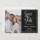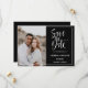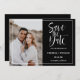 Elegantens fotot sparar datumet, med ett foto av lodrät för favoritbilder på förlovningen på lämnat sida, med information om bröllop på högerna omgiven av vit ram. "Spara datumet" visas i vit skripttypografi över en svart bakgrund. Lägg till ditt namn och information med hjälp av mallen, gå tillbaka till ett matchande svart färg med blanksteg för extra.
