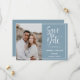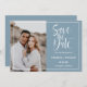Elegantens fotot sparar datumet, med ett foto av lodrät för favoritbilder på förlovningen på lämnat sida, med information om bröllop på högerna omgiven av vit ram. "Spara datumet" visas i vitt skript typografi över en rökblå bakgrund. Lägg till ditt namn och information med hjälp av mallen, gå tillbaka till ett matchande dammigt blått färg med blanksteg för extra.