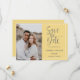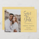 Elegantens fotot sparar datumet, med ett foto av lodrät för favoritbilder på förlovningen på lämnat sida, med information om bröllop på högerna omgiven av vit ram. "Spara datumet" visas i grått-skripttypografi över blekens gult-bakgrund. Lägg till ditt namn och information med hjälp av mallen, gå tillbaka till en matchande gult färg med utrymme för extra-text.