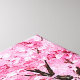 Serenbild av en traditionell japansk trädgård med bedövande körsbärsbädd i träd, arkitektoniska trästrukturer och strömmande vatten-strömmar under en träfotbro i flytande form och i pikturesk.