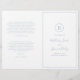 Bröllopsprogrammet med en dammig blå budget med ditt monogram i en cirkel tillsammans med dina bröllop-detaljer omgivna av ett tunt gräns på omslaget. Namn och sidhuvuden finns i ett handskrivet elegant-skript. Insidan har din bröllopsfest och ordning och baksidan har en mall som du kan använda för att lägga till ditt favoritcitat och tacka för ditt meddelande. Den klassiska, traditionella layouten gör detta program underbart för ett formellt bröllop. Dessa bröllopsprogram i billigten trycks på lakan av papper för ett budgetvänligt alternativ.