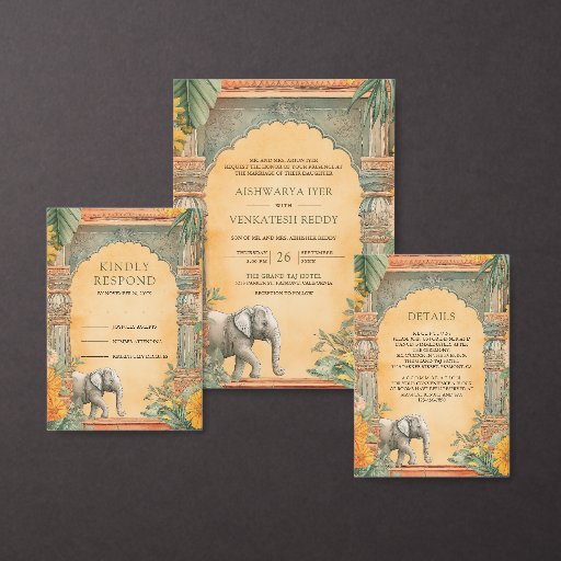 Överraska dina gäster med detta eleganta sydindiska tema bröllop RSVP-kort med vackra traditionella kolonner och vintagearkitektoniska element dekorerade med marigoldblommor och bananblad.