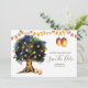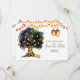 En underbar och livfull illustration med ett stort ekträd fyllt av falska lysande hängande lyktor och sladdbelysning mot en vit bakgrund. Dessa är idealiska för rustika landliga höst-, sommar-, vår- eller vinters "spara datum"-meddelanden. Dessa lyxiga och eleganta platta kort kommer att glädja dina gäster.