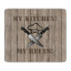 Den här utformningen har en bakgrund med träeffekt med en bild av två skärande knivar och en kock i mitten. Ovanför bilden står stater 'My Kitchen' och nedanför 'My Regler skrev i ett stencilteckensnitt. Texten kan ändras till kostym enligt era egna önskemål.