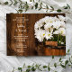 Bjud in gästerna att fortsätta festen morgonen efter vigseln med den charmiga Träfat och Vita Tusenskönor Landlig Brunch-inbjudan efter bröllopet. Denna rustika och chic anpassade lantgårds- eller ranchstil Efter bröllopsfrukost eller lunchinbjudan har en pittoresk digitalt förbättrad blomfotografi av en träfat fylld med vita tusensköna blommor och en väderbiten brun lada träbakgrund.