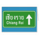Undertecknar den thailändska huvudvägen för den roliga Chiang Rai, Thailand framåt tvåspråkig person skriftligt i thailändskt, och det engelska språket skrivar.