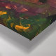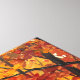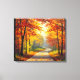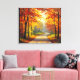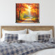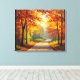 A canvas representation in the impressionist pictorial style of an asphalt path covered with dry leaves around trees in autumn time.