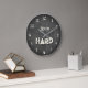 This bold Train Hard wall clock features a dark concrete style background that brings an industrial gym atmosphere into your space. The textured grey surface combined with elegant ivory numbers and typography creates a strong yet clean fitness-inspired design.