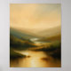 En seren och eterisk oljemålning som skildrar ett stillastående sjö mellan mjukt, valsat backe. Himmel är en varm guld och gul nyans som ger en mjuk glöd som reflekterar perfekt på den stilla vatten nedanför. Den mystiska atmosfären suddar ut det avlägsna landskapet och skapar en drömliknande kvalitet och en känsla av fred och solidaritet. Bensinslagen är mjuka och blandade, vilket understryker naturens harmoni och tysta skönhet.