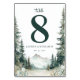 This elegant wedding table card features a serene landscape with tall evergreen trees and distant mountains, rendered in soft watercolor hues. The design centers around a large, stylized number "8" in dark green, complemented by delicate script typography for the word "table." Below, clean serif fonts display customizable names and date, adding a touch of sophistication. The overall mood is tranquil and celebratory, perfect for enhancing the ambiance of your special day.