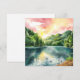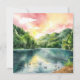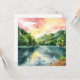 Ett vackert handmålat landskap av en soluppgång, ett berg- och en flodscen.