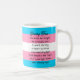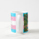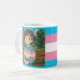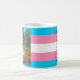 Coffee mug with a trans flag in light blue, pink and white with an anime transgender person in a trans sweater and a pride poem on the back.