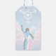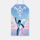 Feminina silhuetter står under en rosa himmel med en vit transgenersymbol i skyn likt fladdermus-signalen, den har ett hjärta i mitten.