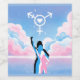 Feminina silhuetter står under en skymd av sockervadd med en vit transgenersymbol i skyn likt fladdermus-signalen, den har ett hjärta i mitten.