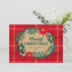 Illustrerade högtidsbotaniska växter och julstjärnor omger en redigerbar hälsning på en träskiva som ligger ovanpå en rutig bakgrund.