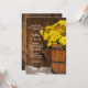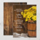 Bjud in gäster för att fira den nygifta bruden och brudgummen på morgonen efter deras vigsel med den charmiga Wooden Bucket och Yellow Daisies Country Post Wedding Brunch Inbjudan. Denna avslappnade men ändå klassiska anpassade rustic chic lantliga efter vigsel frukost eller lunch inbjudan har ett pittoreskt digitalt förbättrat blomfoton av en trä tunna fylld med gula tusensköna blomblommor och en vittrad brun lada träd bakgrund.