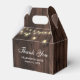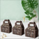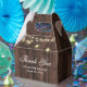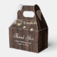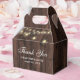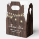 Rustik trälåda för bröllopsgästernas tack med strängljus på en bakgrund av gammalt trä.
