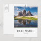 Photo postcard of the famous three peaks of the Tre Cime di Lavaredo or Drei Zinnen Dolomites mountain with reflection in the water of a puddle on a beautiful day in South Tyrol/Trentino Alto-Adige in Northern Italy with a white box with the text 'Drei Zinnen, Italy' and lines in green, white and red, the colors of the italian flag.