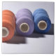Tre Spolar av tråd eller garn: orange, lila och blå.