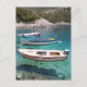 Tre grekiska fiskebåtar flytande på kristallklar vatten