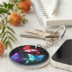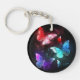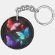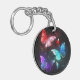 Tre luminösa, röda, lila, grönt, texturerade, mörka fjärilar på svart luminös bakgrund.