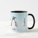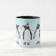 Desteis ursprungliga illustration av tre festliga Gentooppenguiner som håller färglös ljus med sina näbbar. En penguin bär en grönt scarf, en annan bär lila örarskydd och den tredje penguin i mitten bär en röd och vit julhatt. Bakgrunden är en ljusblå övertoning. Det finns också ett anpassningsbara textområde för en namn eller annan anpassningsbar.