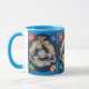"Hare Trinity", det här är min senaste tolkning av en mycket gammal design. Min ursprungliga målning är akryl på canvas, men nu kan du njuta av det på ett kaffe mugg! Tre kaniner tre öron. Kaninen i måne och träd som har en lysande fyraårstid stärker symbolen för fertilitet och förnyelse. Turkosblå bakgrund, insida och handtag är ett vibrerande färg. Som alltid är min teckning originell och upphovsrättsskyddad. Nyfiken teckning och design av Tuzi Williams.