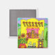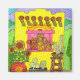 Dessa tre nyfikna katter är sitta i det rosa fönstret av en ljusstark gult Taos-stil i sydvästra Amerika. Riktigt texturerad kaki och solblommor i färgade talavera, liksom sol som målas över fönstret, accentuerar huset och ger en välkommen kontrast till ökensand. Lila berg och grönt gör bakgrunden ljusare under ett grumligt, ljust blå himmel.