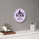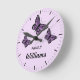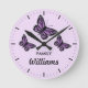 Denna klocka har tre vackra illustrationer av lila fjärilar på en lila bakgrundsfärg. Klockans yta är gjord av enkla och stilrena svarta linjer. Det finns också text som lyder "Familj" med ett anpassningsbart textfält för namnet.