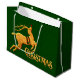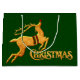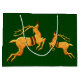 Två gyllene renar längst fram i den här presentsäcken, en med julkonst i ord i guld på baksidan, alla mot grönt-damm med röda accenter. Det finns också en version av personligen.