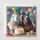 Bild med Party-hattar med ballonger och en födelsedagskaka tre piebaldhästar.