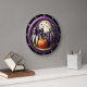 Denna unika Halloween-illustration har ett runt ram med tre pumpor under ett ljust fullt med fladdermus. Pumpen innehåller en vit och svart rand med stor lila, en lila och grönt som är mönstrad och en klassisk orange-pumpa. Scenen har en ljuvlig känsel.