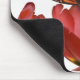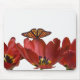 Tre röda tulpaner och en monarch-fjäril mot musmatta