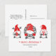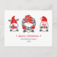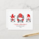 Tre roliga tomtar från nordisk folktradition pryder dessa söta högtids- och festkort i röd och grå ton mot vit bakgrund. Tomten till vänster bär en klassisk skandinavisk hatt med renhorn och håller i en röd bjällra, tomten i mitten bär en röd och vit randig hatt och på hans huvud sitter en klassisk julkrans med vit julkula, tomten till höger har en fin jultomtehatt och kommer med en fin present. "God Jul" visas under i röda serif-bokstäver, med ditt/dina efternamn och året i klassisk grå stil. Personliggör baksidan med ett eget meddelande om så önskas.