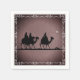 En silhuettbild av de tre Wise Manar ridkamerorna efter Bethlehem-stjärnan på en blekt chokladbakgrund med en vit filigree gräns. Bild kredit: Pixabay.com image #1299283, image# 488204