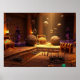 En förtjusande underjordisk skattkammare fylld med gleaming guld mynt, mousserande stenar och ornate chests. Två serpentina figurer, försedd med mönster, skyddar skatterna i en dramatisk ljuds- och skugglek. Rummet har en gammal stenarkitektur med synliga fällor och mekanismer som skapar en atmosfär av mysterium och äventyr.