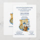This design brings a high-seas adventure to life with a detailed treasure chest overflowing with gold coins and pearls. A vintage map and golden compass sit behind a glass message bottle topped with a blue bow, all set against a backdrop of a grand sailing ship and curling blue waves. The clean white layout features easy-to-read navy blue lettering that organizes all the event details clearly. It offers a classic pirate or nautical theme that captures the excitement of finding hidden riches on a tropical beach.
