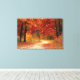 En kuperad grus- och sandväg genom en vacker skog av vackra halvnattssvarta och träkol-trunkar i träd som är fyllda med vibrant färg hösten löv av ruby, guld och citrin!