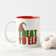 Ha en roligt och rolig jultomte med denna festliga helgdag som lyder "Treat Unga Elf" i rött och grönt. En röd och grönt strimlad hatt med en gyllene klockklack vilar ovanpå ord. Sprid dig till någon helgdag humor!