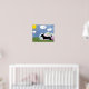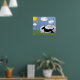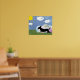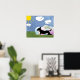 Denna svarta och vita tecknad stil lycklig hund runt bollar i hund Treibball. Den enkla poster är ljus och glad med hund på gräs i grönt, vita moln, blå texturerad bakgrund himlar, gult sol och fågellsiluetter som flyger över huvudet.