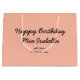 Inledning av trendiget och kvinnlig vår hue: Mjuk persika. Höj presenten med vår moderna och snyggt stora grattis på födelsedagen-presentväska, med anpassade i ett sött handskrivet tittar teckensnitt och namnteckning. Dess enkla men ändå elegant-design i färg ger en tidlös appell, perfekt för födelsedagar, studenten, Påsk, duschar och mycket mer. Utforska vår mångsidiga vår-trend färg för att samordna produkter eller hitta andra snyggtar som passar din dekoration.