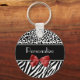 En svart och vit nyckelkedja för mönster från trendiget med modernt zebra ränder på grund och en snyggt leopard trycks på toppen och förskönas med ett gigrött band som är bundet till en båge. Anpassa den här chicens kvinnonyckelring i mode genom att lägga till ditt namn. Platt bild, inte verkligt menyfliksområde.
