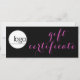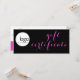 Trendiget rosa och svart mall för presentcertifikat för företag. Chicen biet har ett calligraphy-skript med stil-typsnitt på framsidan i shock rosa på svart, som lyder "Gift Certificate". Det finns också utrymme för en logotyp av ett företag. På baksidan finns det ytterligare redigerbar anpassningsbar i rosa på vit färg överst och svart på rosa vid botten.. färg bakgrund. Texten innehåller uppgifter om presentkort - till, från och med sista giltighetsdag och värde/belopp samt uppgifter om det företag som utfärdar presentkupongen - företaget namn, gatuföretaget adress, det mobila kontaktnumret och en webbplats.