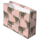 Ett lyxigt leoparddjur illustrerar mönster, över en lätt korall, ljus rosa enkel bakgrund. Den här vild katt sömlösa mönster, originalkonsten, illustration av eleganten, djurtryck, sofistikerad teckning, giglila, lätta, mjuka leopardbilder av shabby chic är idealiska för bära eller hemmadekorering. En snyggt, trendig, chic, giftig grafik, enkel grafik, elegant.