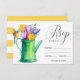 Trendig Rustic stil bröllopsinbjudningar OSA med en vattnande burk av tulpaner och blommor och en fågel och vit och gult stripe mönster på kortets baksida. Dessa inbjudan är perfekter för en land-, bondgård-, trädgårds-, party- eller barnyard- eller stil-bröllopsfest. Den här designen är även tillgänglig för andra händelser. Kontakta oss via butiken om du vill ha anpassningsbar